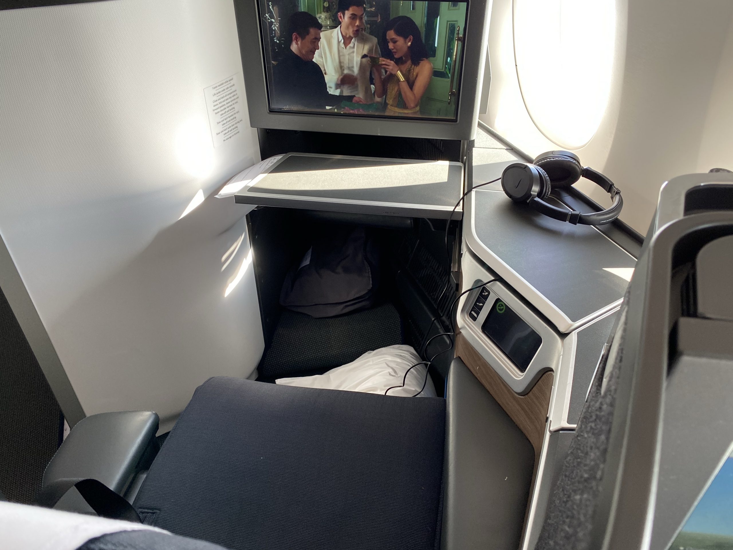 The seat width was approximately 27 inches (68/69 centimetres), with plenty of storage space and power sockets that accept UK and US plugs. In addition, all seats have USB power ports, a vanity mirror and the most important thing, a door that can be closed after takeoff.
